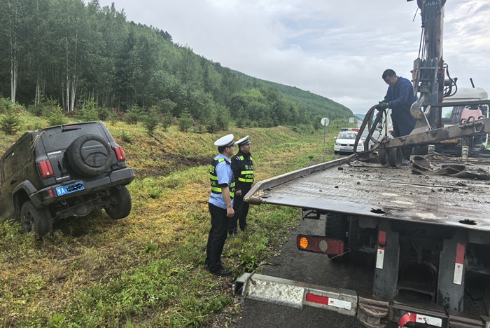 大興安嶺圖強(qiáng)鎮(zhèn):雨天越野車(chē)墜入路基下 交警緊急救援
