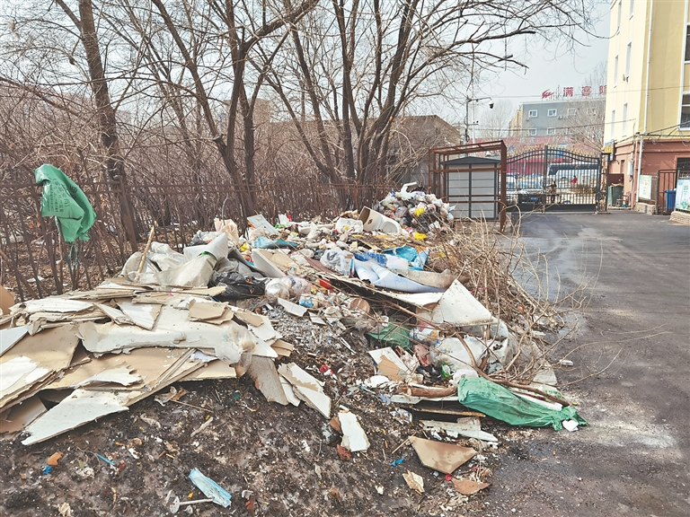 南崗區(qū)學(xué)府路300號至308號之間,是一片改造后的老舊小區(qū),一側(cè)大門還有戴紅袖標的人員看守。進入后,道路一側(cè)出現(xiàn)了垃圾帶,生活垃圾、裝修垃圾、放棄雜物和殘冰殘雪,堆出了20米的“長龍”。據(jù)這里的居民介紹,小區(qū)沒有物業(yè),衛(wèi)生由街道管理?!坝捎陂L期不外運,天熱的時候,這里的垃圾會很臭。其實小區(qū)環(huán)境還不錯,就是缺少管理?!?/span>