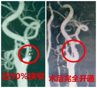 在神經(jīng)外一科醫(yī)護團隊的精心管理及護理下,張大爺術(shù)后第二天即可下地活動,肢體反復(fù)癱瘓等癥狀消失,并且左眼視物不清的癥狀消失。復(fù)查頸部CTA檢查,左側(cè)頸內(nèi)動脈管徑完全恢復(fù)正常,避免了腦卒中發(fā)生的危險。
