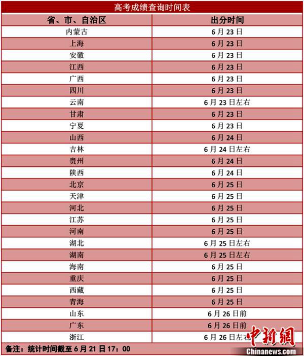 根據(jù)各省份此前公布的時(shí)間,6月23日起各地將陸續(xù)公布高考成績(jī),查分時(shí)間主要集中在23至26日。