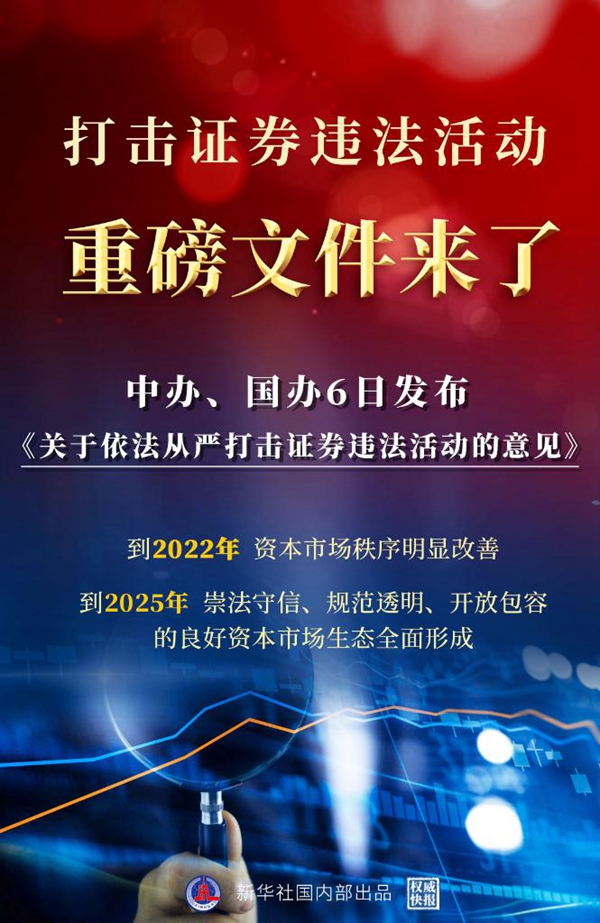 新華社北京7月6日電(記者張千千 劉慧)中共中央辦公廳、國務院辦公廳6日公開發(fā)布了《關(guān)于依法從嚴打擊證券違法活動的意見》,對建立健全資本市場執(zhí)法司法體制機制、依法從嚴打擊證券違法活動、推動資本市場高質(zhì)量發(fā)展作出重要部署。