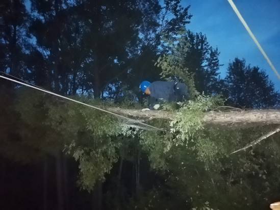 飛機(jī)巡查發(fā)現(xiàn)的呼碧線128號電線桿和129號電線桿之間線路故障處,由呼中輸電運(yùn)檢班組負(fù)責(zé)搶修,需搶修人員步行穿過密林和水道,經(jīng)過1個多小時的艱難跋涉方能到達(dá),現(xiàn)場電線上掛著一棵直徑40多厘米的風(fēng)倒樹,導(dǎo)致電線破損,搶修人員將風(fēng)倒樹用手鋸切割移除,并對破損電線進(jìn)行補(bǔ)強(qiáng),截至21時30分,呼碧線兩處故障全部搶修完畢,呼中區(qū)陸續(xù)完成供電。