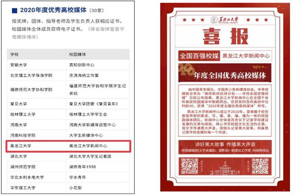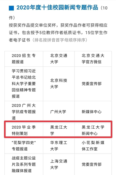 據(jù)了解,在此次全國百強(qiáng)校園媒體評(píng)比中,黑龍江大學(xué)新聞中心位列前40,獲評(píng)“2020年度全國優(yōu)秀高校媒體”稱號(hào),創(chuàng)造了該校參評(píng)以來的最好成績(jī)。