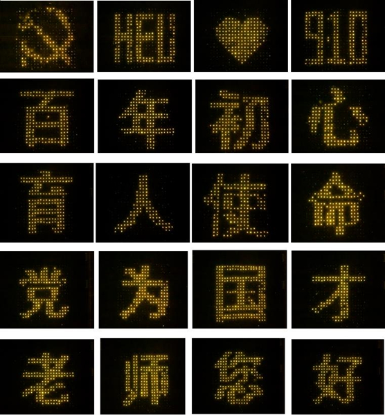 黨徽、HEU(哈工程縮寫)、愛心、9.10、百年初心、育人使命、為黨育人、為國育才、老師您好……同學們匯聚力量共同拼出了24組圖案和字樣,即使天空飄起毛毛細雨,他們也絲毫沒有變換位置,在雨中足足站了兩個小時。2021級博士生王文軒感慨:“作為一名本、碩都就讀于哈工程的學生,這所大學的老師教會了我如何做人做事做學問,我們用這場燈光秀,獻禮我們最尊敬的老師,我們也一定會傳承哈軍工精神,勇擔強國百年使命擔當?!?/span>