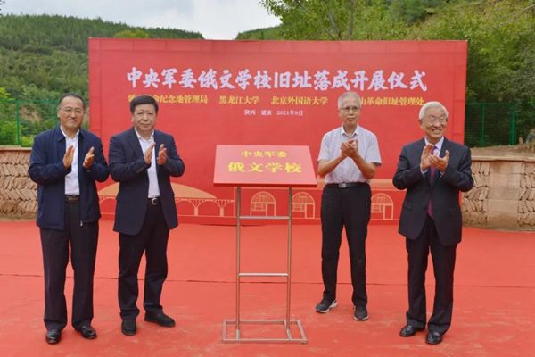 延安革命紀念地管理局黨委書記薛耀軍、黑龍江大學黨委書記王永清、北京外國語大學校友總會會長楊學義工、中央軍委俄文學校校長曾涌泉之子曾建為中央軍委俄文學校舊址展覽揭牌。