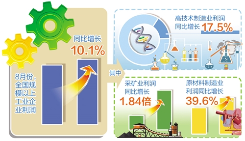 從1月份至8月份累計(jì)看,41個(gè)工業(yè)大類(lèi)行業(yè)中,37個(gè)行業(yè)利潤(rùn)總額同比增長(zhǎng),1個(gè)行業(yè)扭虧為盈,1個(gè)行業(yè)持平,2個(gè)行業(yè)下降。其中,石油、煤炭及其他燃料加工業(yè)利潤(rùn)總額同比增長(zhǎng)24.71倍,石油和天然氣開(kāi)采業(yè)增長(zhǎng)2.65倍,有色金屬冶煉和壓延加工業(yè)增長(zhǎng)1.78倍,黑色金屬冶煉和壓延加工業(yè)增長(zhǎng)1.56倍,化學(xué)原料和化學(xué)制品制造業(yè)增長(zhǎng)1.45倍,煤炭開(kāi)采和洗選業(yè)增長(zhǎng)1.45倍。