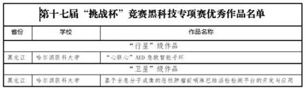 黑龍江經(jīng)濟網(wǎng)訊(黑龍江日報全媒體見習記者董廣碩 商祺)近日,第十七屆“挑戰(zhàn)杯”全國大學生課外學術科技作品競賽落下帷幕,哈爾濱醫(yī)科大學附屬二院團隊《“心聯(lián)心”AED急救智能手環(huán)》和哈醫(yī)大附屬腫瘤醫(yī)院團隊《基于全息分子成像系統(tǒng)的惡性腫瘤前哨淋巴結活檢檢測平臺的開發(fā)與應用》兩個作品在“黑科技”專項賽終審決賽中,分別榮獲“行星級”和“衛(wèi)星級”稱號。
