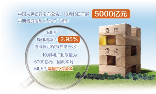 10月15日,月中“麻辣粉”(MLF)如期端出。中國(guó)人民銀行發(fā)布公告稱,為維護(hù)銀行體系流動(dòng)性合理充裕,15日開展5000億元中期借貸便利(MLF)操作(含對(duì)10月15日MLF到期的續(xù)做)。MLF操作利率為2.95%,與9月持平,并連續(xù)多月保持在這一水平。10月MLF到期量為5000億元,因此本月MLF為等量平價(jià)續(xù)做。