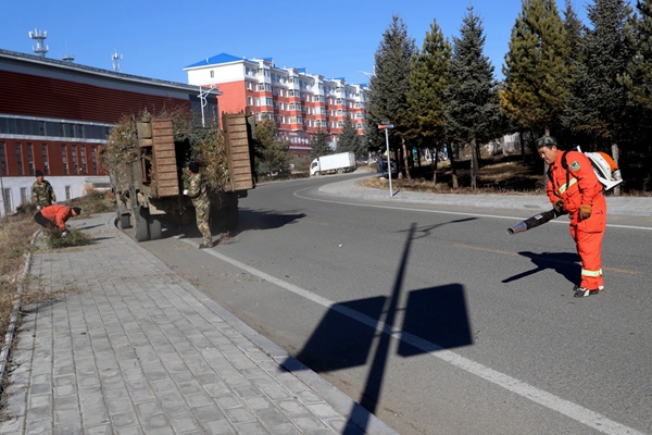 圖為阿木爾林業(yè)局森林消防大隊專業(yè)撲火隊員利用風力滅火機將林海路路面上的碎石塵埃清除干凈(王力/攝)