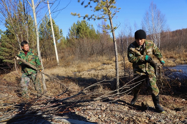 圖為阿木爾林業(yè)局森林消防大隊專業(yè)撲火隊員將修剪下來的樹枝裝車運走(王力/攝)