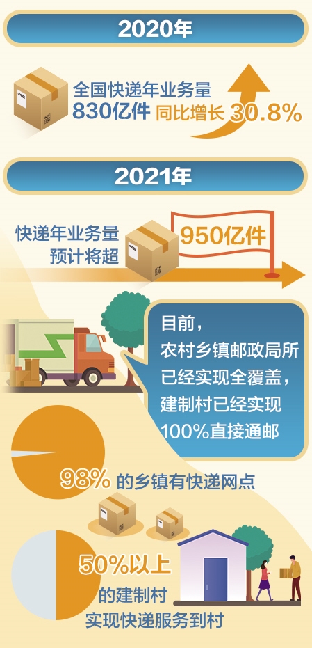 當(dāng)前,快遞年業(yè)務(wù)量以每年遞增100億件的速度持續(xù)高速增長。據(jù)國家郵政局預(yù)測(cè),2021年快遞年業(yè)務(wù)量將超950億件。