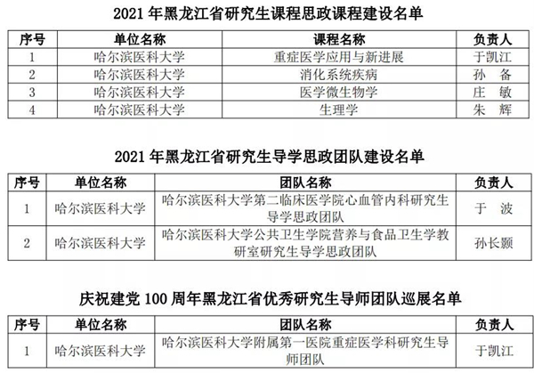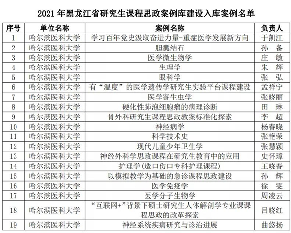 黑龍江經(jīng)濟(jì)網(wǎng)訊(黑龍江日?qǐng)?bào)全媒體見習(xí)記者董廣碩 商祺)為貫徹落實(shí)國(guó)家《關(guān)于全面落實(shí)研究生導(dǎo)師立德樹人職責(zé)的意見》《高等學(xué)校課程思政建設(shè)指導(dǎo)綱要》《關(guān)于加快新時(shí)代研究生教育改革發(fā)展的意見》精神,按照《關(guān)于加快新時(shí)代黑龍江省研究生教育改革發(fā)展的實(shí)施意見》要求,日前,經(jīng)全省研究生培養(yǎng)單位遴選推薦,黑龍江省研究生課程思政教育聯(lián)盟專家委員會(huì)評(píng)審,省學(xué)位委員會(huì)、省教育廳批準(zhǔn),哈爾濱醫(yī)科大學(xué)共有26個(gè)項(xiàng)目獲批省級(jí)立項(xiàng),其中研究生課程思政課程建設(shè)項(xiàng)目4個(gè)、研究生導(dǎo)學(xué)思政團(tuán)隊(duì)(導(dǎo)師)建設(shè)項(xiàng)目2個(gè)、研究生課程思政案例19個(gè),慶祝建黨100周年巡展優(yōu)秀研究生導(dǎo)師團(tuán)隊(duì)1支。