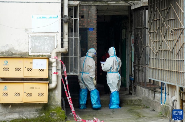 11月4日,在重慶九龍坡區(qū)九龍街道,兩名身穿防護服的青年志愿者準備入戶核對信息。