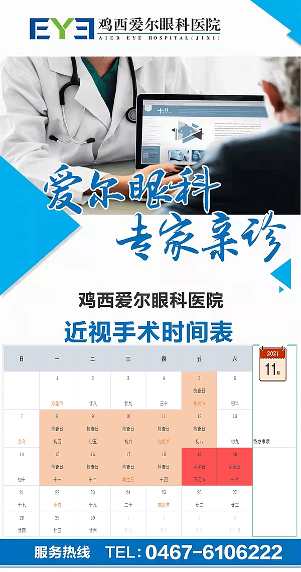 雞西愛(ài)爾眼科醫(yī)院近視手術(shù)時(shí)間表: