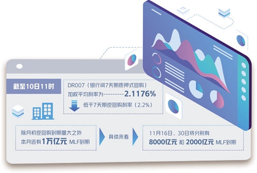 數(shù)據(jù)顯示,11月1日至5日,共計1萬億元規(guī)模的逆回購陸續(xù)到期。除月初逆回購到期量大之外,本月還有1萬億元MLF到期,為今年以來最高值。具體來看,11月16日、30日將分別有8000億元和2000億元MLF到期。