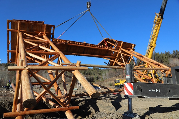 早上10點(diǎn)58分,只見(jiàn)平靜的林業(yè)局薩布素軍馬場(chǎng)頓時(shí)熱鬧了起來(lái),兩臺(tái)大型起重機(jī)發(fā)動(dòng)機(jī)嗡嗡作響,一東一西緩慢吊起10多噸重的大門(mén),因偏向一側(cè)首次作業(yè)沒(méi)有成功。安裝技術(shù)人員調(diào)整重心點(diǎn),第二次試舉,并在一臺(tái)裝載機(jī)的協(xié)助下,調(diào)整機(jī)位,歷時(shí)2個(gè)多小時(shí),才將具有濃郁驛站文化風(fēng)格的高10米、寬14米的木質(zhì)大門(mén),矗立在平地上。