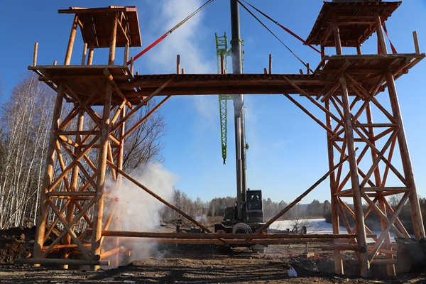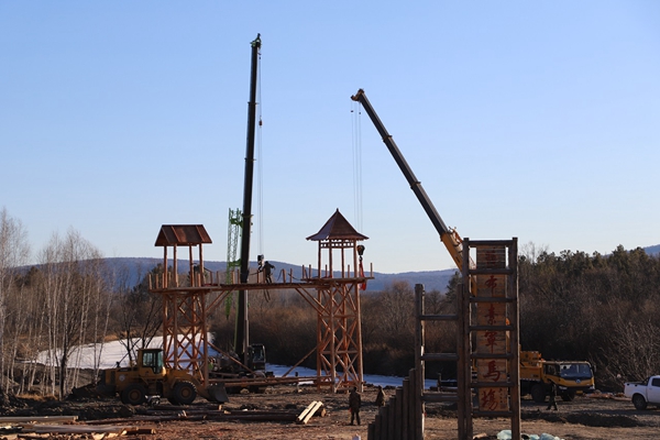 阿木爾林業(yè)局薩布素景區(qū)的薩布素軍馬場(chǎng)大門(mén)被緩緩起吊起來(lái)(王力/攝)