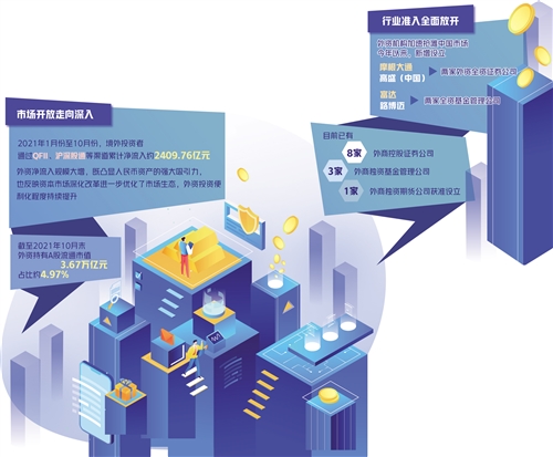 一系列開(kāi)放舉措吸引了外資的高度關(guān)注和認(rèn)可,外資參與中國(guó)市場(chǎng)熱情高漲,在華投資展業(yè)活動(dòng)加快推進(jìn)。截至2021年10月末,外資持有A股流通市值3.67萬(wàn)億元,占比約4.97%。