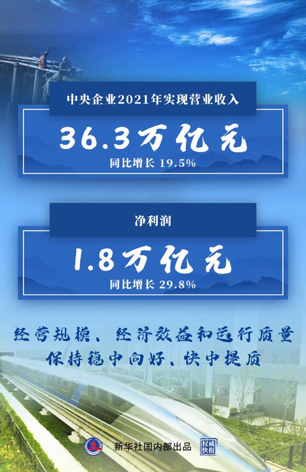 2021年,中央企業(yè)完成固定資產(chǎn)投資(不含房地產(chǎn))3.2萬億元,同比增長(zhǎng)10.1%;上繳稅費(fèi)2.4萬億元,同比增長(zhǎng)20%;截至去年末中央企業(yè)資產(chǎn)負(fù)債率保持在64.9%,圓滿完成預(yù)期目標(biāo)。