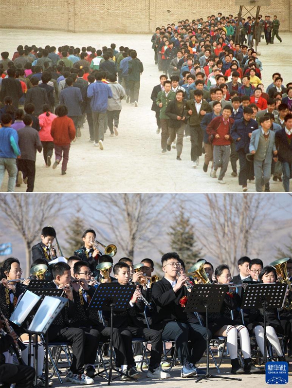 拼版照片:上圖為2001年,會(huì)寧縣二中學(xué)生跑步鍛煉身體(新華社記者 武斌 攝);下圖為2022年1月19日,會(huì)寧縣會(huì)師中學(xué)交響管樂(lè)團(tuán)學(xué)生在戶(hù)外表演交響樂(lè)(新華社記者 馬希平 攝)。