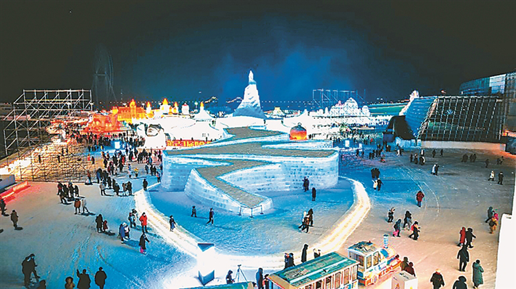 哈爾濱冰雪大世界“冬夢(mèng)飛揚(yáng)”以北京冬奧會(huì)會(huì)徽“冬夢(mèng)”為靈感來源。