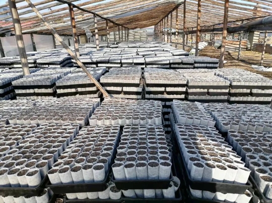 呼中林業(yè)局中心苗圃輕基質(zhì)容器育苗杯數(shù)量已完成10萬+(陳東輝 攝)