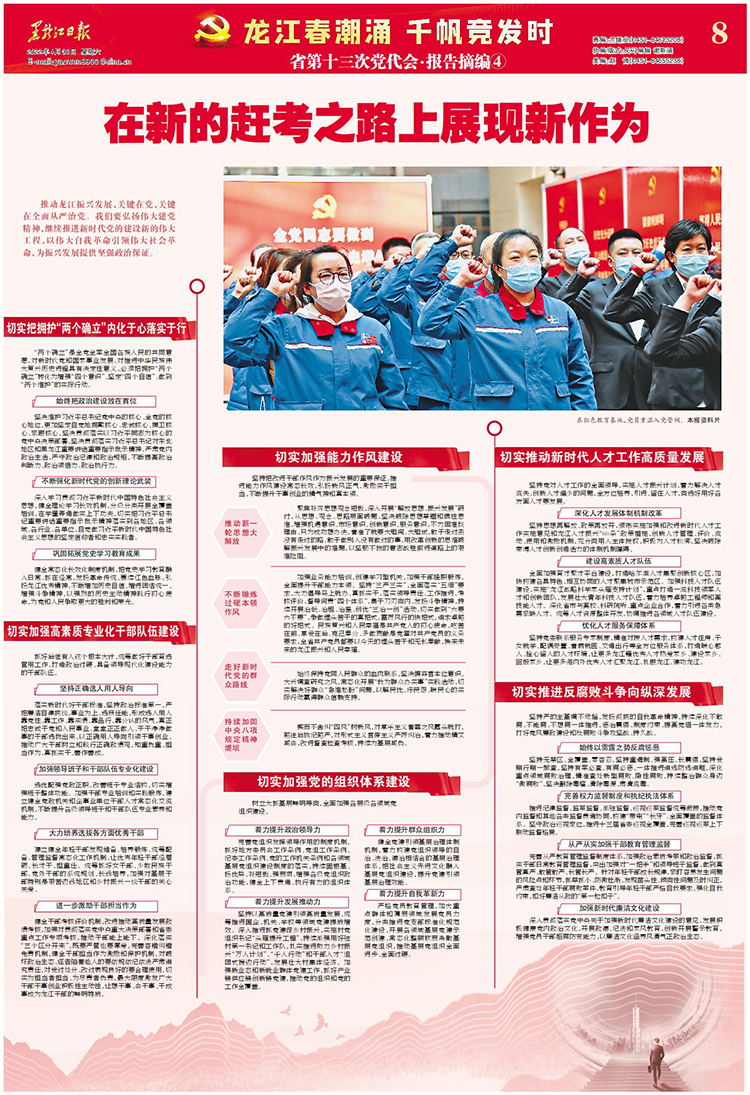 推動龍江振興發(fā)展,關(guān)鍵在黨,關(guān)鍵在全面從嚴治黨。我們要弘揚偉大建黨精神,繼續(xù)推進新時代黨的建設(shè)新的偉大工程,以偉大自我革命引領(lǐng)偉大社會革命,為振興發(fā)展提供堅強政治保證。
