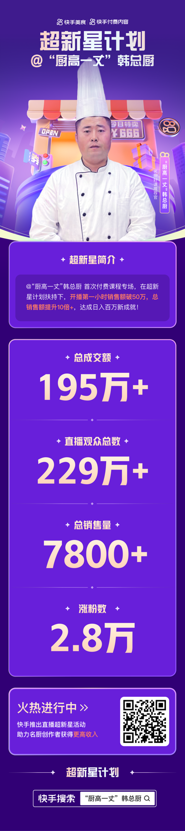 前不久,快手美食主播“廚高一丈韓總廚”(快手ID:hanzhongchu666888)參加了快手官方舉辦的“超新星計(jì)劃”,開(kāi)啟付費(fèi)課程直播專(zhuān)場(chǎng),最終取得總成交額195萬(wàn)+,總銷(xiāo)售量7800+的亮眼成績(jī)。