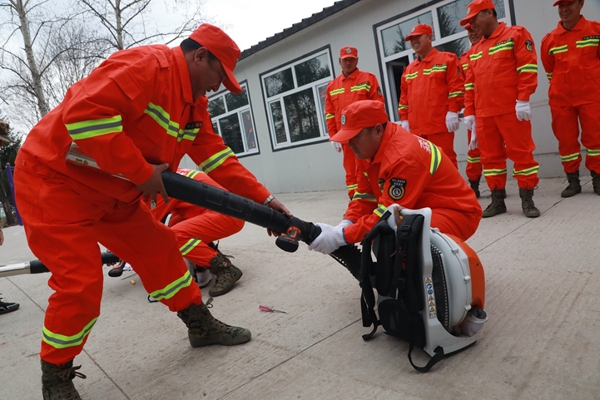 阿木爾林業(yè)局依東林場專業(yè)撲火隊(duì)員在進(jìn)行拆解安裝風(fēng)力滅火機(jī)比賽(王力 攝)