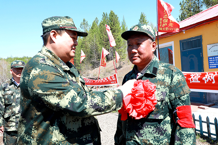 阿木爾林業(yè)局黨委書記胡守慶(左)為依東林場即將退休的共產(chǎn)黨員、管護(hù)員滿德江(右)戴上“光榮花”。(王力 攝)