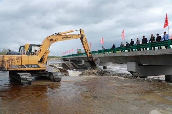 阿木爾林業(yè)局調(diào)派大型機械設(shè)備,挖開楚龍溝河大橋臨時便道,進行泄洪,確保G111國道安全(王力 攝)