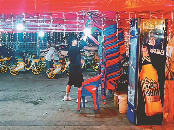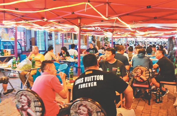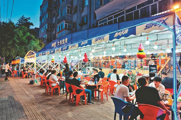 夜幕降臨,冰城街路的大排檔里,人們一邊吃著燒烤海鮮,一邊喝著啤酒,談天說地,不亦樂乎……仲夏六月,在大排檔允許外擺政策的推動下,夏日“夜經(jīng)濟(jì)”越來越火熱,冰城濃濃的“煙火氣”回歸。大排檔既豐富了市民生活,冰城的快樂消費(fèi)也開始了。