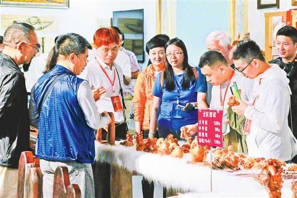 網(wǎng)絡名人在永達木藝參觀北沉香工藝品(胡錫韋/攝)。