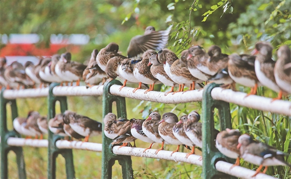 13日,哈爾濱市兆麟公園鴛鴦湖邊,近300只野生鴛鴦在湖邊欄桿上休息,密密麻麻排出近百米的“長龍”。公園專職看護(hù)鴛鴦的職工車春虎介紹,目前在公園內(nèi)及周邊出生的小鴛鴦已經(jīng)長大,加上從周邊濕地飛來的鴛鴦,每天早晚來鴛鴦湖覓食的鴛鴦數(shù)量接近300只,這一數(shù)量還在持續(xù)增長?!邦A(yù)計(jì)國慶節(jié)前后,數(shù)量能超400只。”
