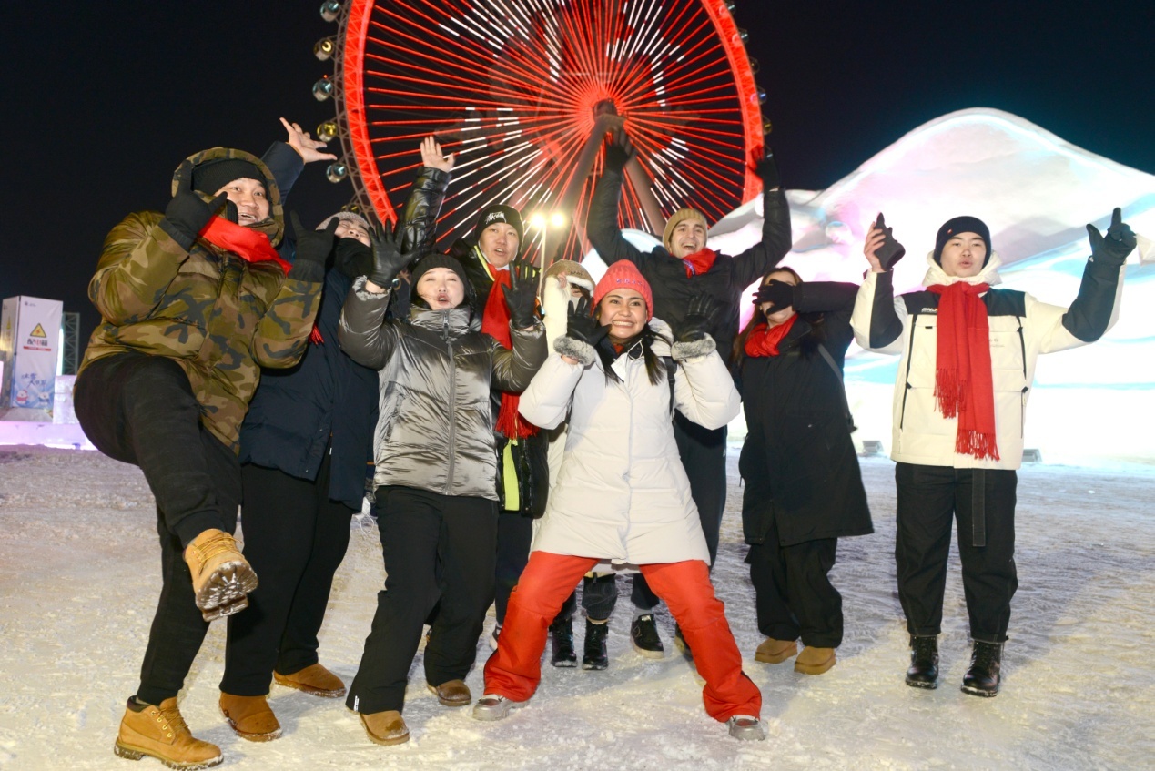 當(dāng)天上午,在雪博會(huì),來(lái)自黑龍江大學(xué)的各國(guó)留學(xué)生代表與中國(guó)青少年結(jié)對(duì)互動(dòng),互贈(zèng)新春禮物,表達(dá)對(duì)即將迎來(lái)的兔年美好祝福。中外青少年小手拉大手,共游太陽(yáng)島雪博會(huì),鯉魚(yú)躍龍門(mén)、圓夢(mèng)啟程、雪冠博覽等雪雕雪景讓大家流連忘返。世界各國(guó)青少年一起雕刻“宇航員”雪雕,送上春聯(lián)祝福語(yǔ),體驗(yàn)了中國(guó)傳統(tǒng)文化和濃濃的年味,表達(dá)了對(duì)世界文化共融的美好祝愿。
