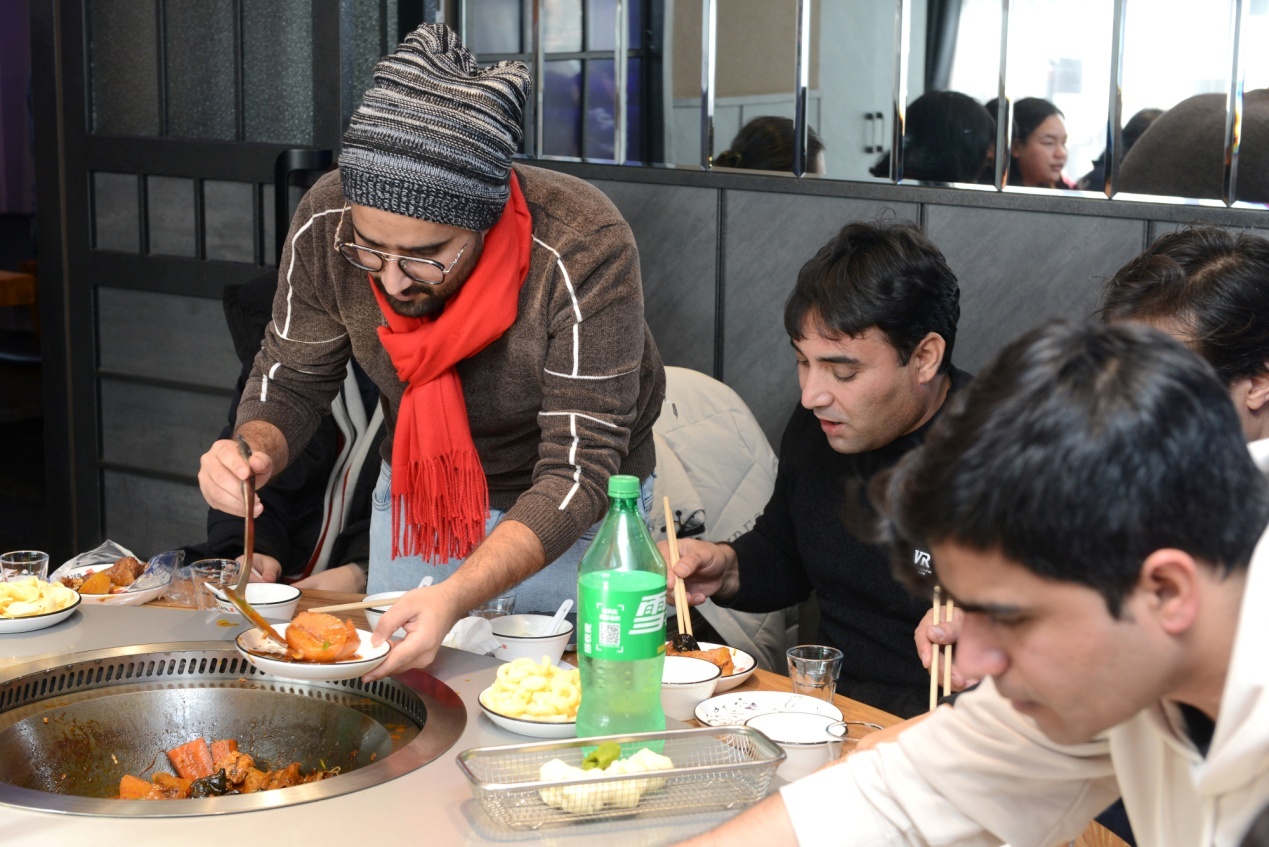 中午,留學(xué)生們品嘗了東北特色美食“鐵鍋燉”——鐵鍋燉大鵝、燉排骨,東北特色鍋包肉、拔絲地瓜讓留學(xué)生們感受了中華美食的魅力,大家紛紛贊嘆中華美食文化的博大精深,雖然遠(yuǎn)離家鄉(xiāng),卻在熱氣騰騰的美食中感受到家的溫暖。品味美食的過(guò)程中,有的留學(xué)生穿上東北特色大花襖,有的穿上中國(guó)傳統(tǒng)服飾雪披風(fēng),系上花圍巾,大家喜不勝收,將中國(guó)元素展示給世界。
