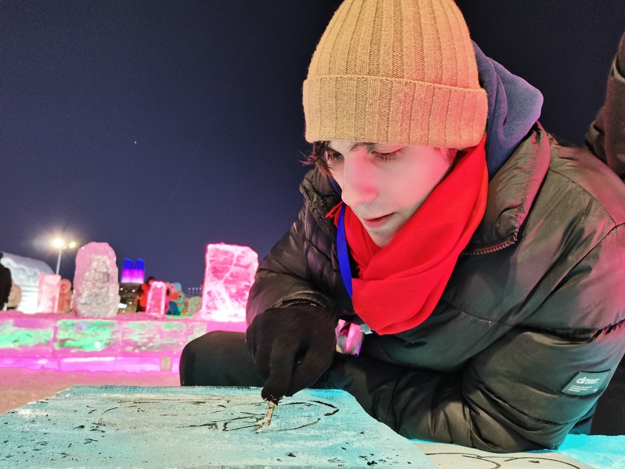 傍晚,中外青少年在流光溢彩、美輪美奐的哈爾濱冰雪大世界中感知冰雪藝術(shù)的魅力。在冰雪藝術(shù)體驗(yàn)營(yíng)聆聽(tīng)冰雕制作過(guò)程,學(xué)習(xí)將冰與中國(guó)傳統(tǒng)木刻版畫(huà)相結(jié)合,親手設(shè)計(jì)制作屬于自己獨(dú)一無(wú)二的冰版畫(huà),體驗(yàn)冰雪帶來(lái)的樂(lè)趣。