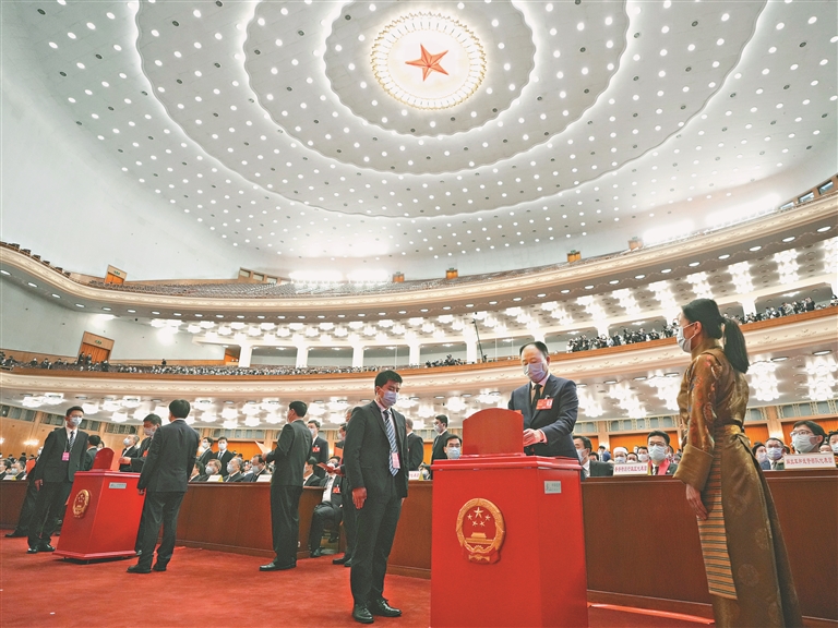 3月10日,十四屆全國人大一次會議在北京人民大會堂舉行第三次全體會議。這是代表在投票。新華社記者 王毓國攝