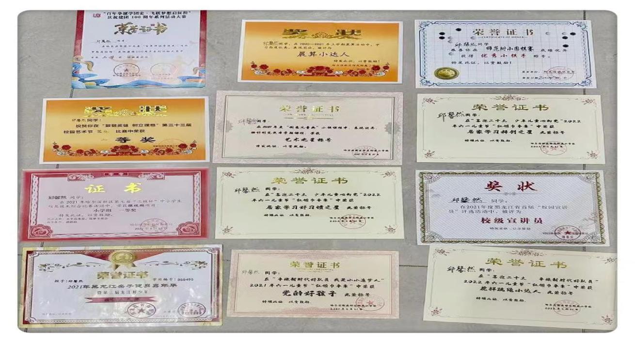 在成長過程中,面對學(xué)習(xí),她不斷挑戰(zhàn)自我,勇于創(chuàng)新,努力去探索新領(lǐng)域,收獲新知識。邱馨然不僅熱愛學(xué)習(xí),而且注重興趣的發(fā)展,先后獲得中國歌劇舞劇院頒發(fā)的全國社會藝術(shù)水平考級朗誦九級,中國舞蹈家協(xié)會頒發(fā)中國舞九級,中國音樂學(xué)院頒發(fā)古箏二級,文化和旅游部發(fā)展中心頒發(fā)硬筆書法四級,中國文化信息協(xié)會頒發(fā)“文明與藝術(shù)”少年英才藝術(shù)全國總展演獨(dú)舞一級等11個(gè)國家級獎(jiǎng)項(xiàng)和30多個(gè)省級、市級、區(qū)級、校級獎(jiǎng)項(xiàng)。