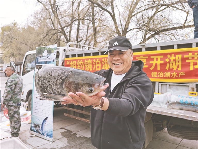 游客手捧開湖大魚。本報(bào)記者 張雪地?cái)z