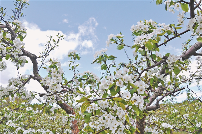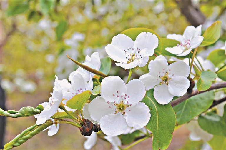 一場(chǎng)小雨過(guò)后,花瓣上、樹葉上一滴滴晶瑩剔透的水珠給梨樹增添了幾分韻味,梨花帶雨,讓人又憐又喜。漫步梨園,樹上朵朵梨花如雪,地面蒲公英花金黃,頭頂是湛藍(lán)的天空和朵朵白云,一只只繁忙的小蜜蜂在花間“起舞”。漫步其中,仿佛游走于一幅畫卷中,讓人只想留住這美麗的瞬間。