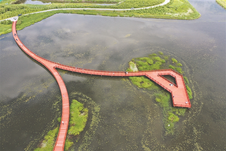 10日,哈爾濱市群力外灘濕地公園內(nèi),許多市民前來(lái)踏青游玩。持續(xù)多日的降雨,使得濕地內(nèi)的植物生長(zhǎng)得更加茂盛,綠樹(shù)如茵、芳草遍地。人們有的走上蜿蜒的棧道觀賞野生鳥(niǎo)類(lèi)和各種水生植物,有的坐在亭臺(tái)里休憩、野餐。孩子們?cè)诓莸厣媳寂苤g笑著,享受踏青帶來(lái)的快樂(lè)。