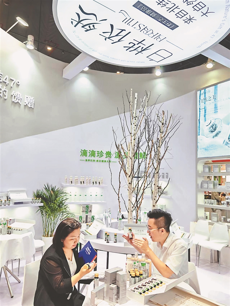“產(chǎn)品所用的白樺汁原料源自鐵力市,這里處在北緯47°小興安嶺的黑土地上?!焙邶埥陼钥萍加邢薰究偨?jīng)理馬光西介紹,公司充分利用龍江“九珍十八品”資源,由雨曉集團與清華大學深圳科研團隊合作,運用先進技術開發(fā)提煉出白樺汁精華,為消費者不斷提供囗感獨特的綠色飲品、化妝品。現(xiàn)在企業(yè)庫存清空,鐵力工廠正加班加點生產(chǎn)。本次展會的火爆出圈,讓企業(yè)對白樺汁系列產(chǎn)品走向世界市場更加充滿信心。