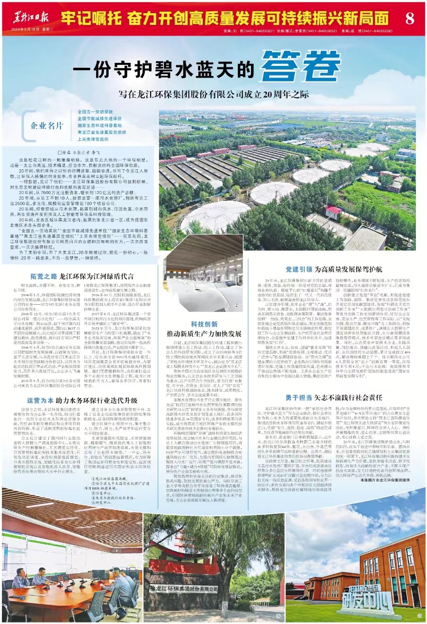 20年間,他們用持之以恒的拼搏進取、砥礪奮進,書寫了令龍江人崇敬、讓環(huán)保人感佩的創(chuàng)業(yè)故事,在業(yè)界高高樹立起環(huán)保標桿。