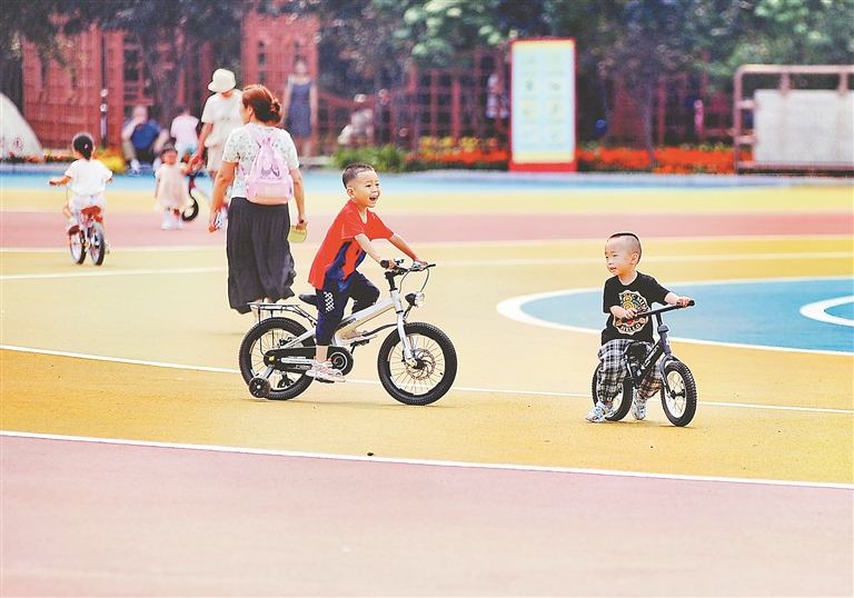 公園內(nèi)4000多平方米的休閑廣場(chǎng),經(jīng)過(guò)改造、彩化,呈現(xiàn)出全新的面貌,孩子們?cè)谏厦骝T車、奔跑。彩色廣場(chǎng)將工業(yè)主題元素融入設(shè)計(jì)理念,與周圍的景觀小品相得益彰。