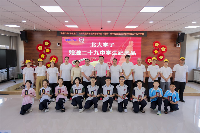 北大學(xué)子向齊市二十九中學(xué)生贈(zèng)送紀(jì)念品并合影