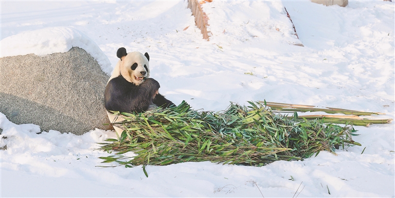 尤其是“佑佑”,曬著午后暖陽,坐在室外的雪地里,大口“狂炫”竹葉,這一口吃夠了,就尋覓著從雪里刨出來一根竹筍,秒變“剝筍小哥”?!坝佑印边€時不時停下來,盯著人群定格幾秒,仿佛是專門為游客拍照擺好姿勢,令不少南方小伙伴感嘆“開了眼界”。