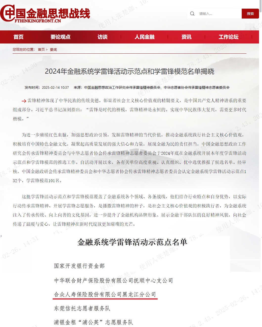 在2024年金融系統(tǒng)學(xué)雷鋒活動(dòng)示范點(diǎn)和學(xué)雷鋒模范評選中,合眾人壽黑龍江分公司黨支部脫穎而出,成功獲評學(xué)雷鋒示范點(diǎn),成為合眾全系統(tǒng)唯一獲此殊榮的單位。這一成績的取得,不僅是合眾人壽黑龍江分公司的榮耀,更是整個(gè)合眾系統(tǒng)的驕傲,為行業(yè)樹立了榜樣。