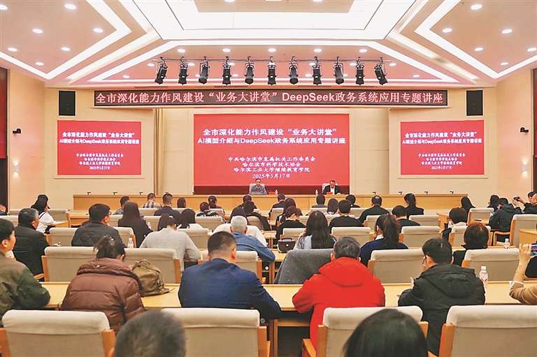 本報訊(記者 趙一諾)為加快提升機關(guān)干部數(shù)字素養(yǎng)與智能技術(shù)應(yīng)用能力,助力政務(wù)工作智能化轉(zhuǎn)型升級,近日,哈爾濱市直機關(guān)工委、哈爾濱市科協(xié)、哈爾濱工業(yè)大學(xué)繼續(xù)教育學(xué)院聯(lián)合舉辦哈爾濱市深化能力作風(fēng)建設(shè)“業(yè)務(wù)大講堂”——AI模型介紹與DeepSeek政務(wù)系統(tǒng)應(yīng)用專題講座。哈爾濱市直機關(guān)和部分區(qū)縣共200余名機關(guān)干部參加學(xué)習(xí)。