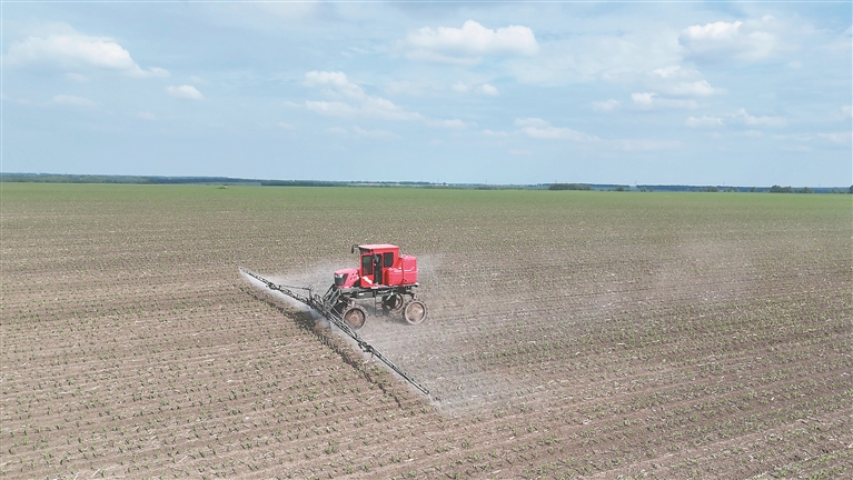 在慶安縣建民鄉(xiāng)玉米種植地塊,兩臺高桿噴霧機與一臺大馬力拖拉機協(xié)同作業(yè),成為田間“主角”。通過可伸展機械臂,一臺高桿噴霧機單次可為40行玉米精準噴施藥劑,同時最大程度降低風力影響,高效完成滅草任務(wù)?!拔覀兞⒇S家庭農(nóng)場有9000多畝地,現(xiàn)在一臺高架車一天能作業(yè)1000畝,4臺機器兩三天就能完成作業(yè)?!苯襦l(xiāng)農(nóng)戶劉立豐感慨道,“小農(nóng)機一天也就作業(yè)百八十畝,這大農(nóng)機速度快了10倍。”在慶安縣國家現(xiàn)代農(nóng)業(yè)科技示范展示基地的水稻田里,無人機手正操控滿載分蘗肥的無人機平穩(wěn)穿梭。依托北斗導(dǎo)航精準定位,肥料被均勻噴灑在稻田中?!皺C械化施肥每畝僅需0.3元,成本是人工撒施的1/5,效率更是傳統(tǒng)人工的5倍以上。”慶安縣農(nóng)業(yè)技術(shù)推廣中心主任范軍介紹,機械噴灑不僅降低成本,更實現(xiàn)了肥料的精準分布,讓每株秧苗都能均衡“吃”到養(yǎng)分。